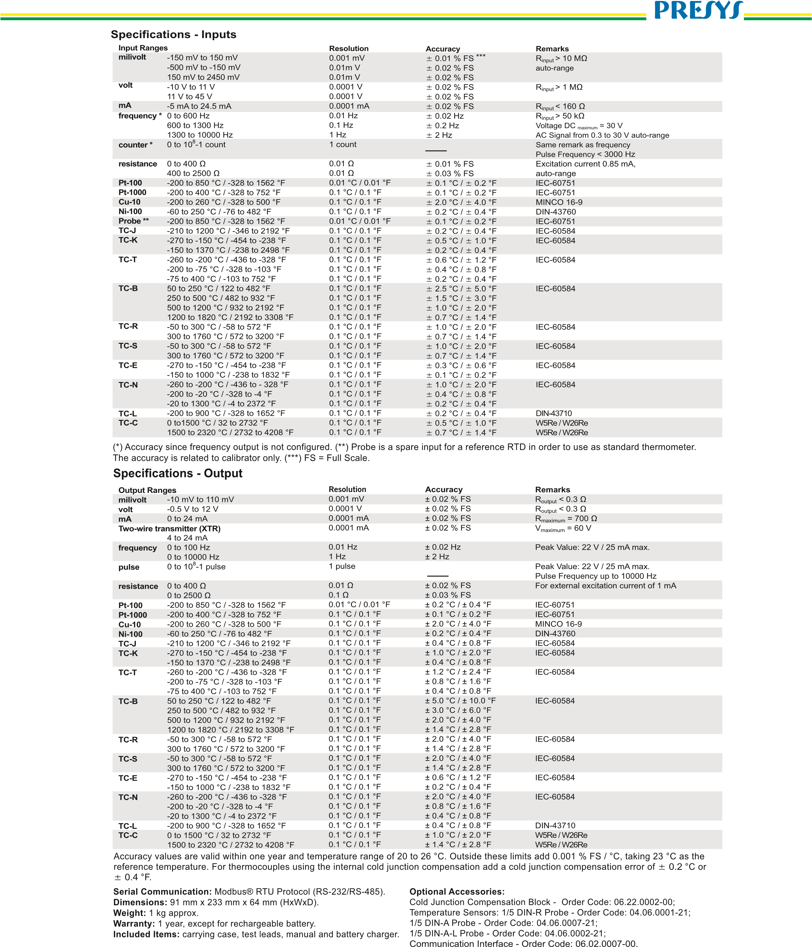 Ölçüm ve Similasyon Parametreleri: mV, V, mA, Ohm, RTD, TC, HzTC Çözünürlük: 0.1°C PT-100 Çözünürlük: 0.01°C